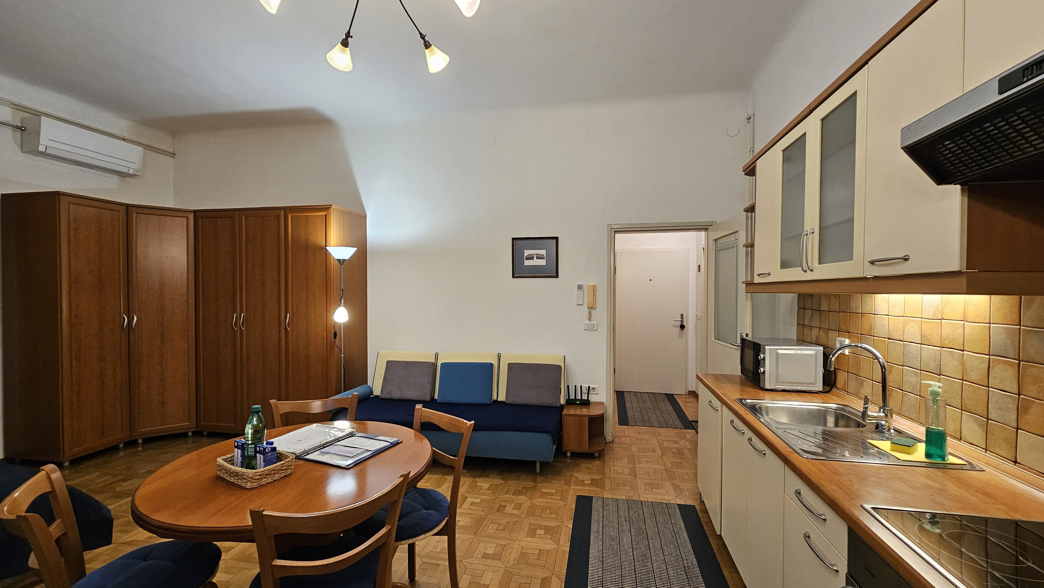 Das Studio befindet sich im Erdgeschoss eines älteren Gebäudes und bietet einen Bett 180 x 200 cm, Couch die in ein Bett (90 x 180 cm) gemacht werden kann, Esstisch und Kücheteil mit elektrischem Kocher und Ofen und großem Kühlschrank, Badezimmer mit Dusche. Das Apartment ist mit Geschirr, Besteck, Toaster, Bettwäsche, Handtüchern, Waschmaschine, Bügeleisen mit Bügelbrett, Haartrockner, CATV (LCD), Telefon, kostenlosen Wi Fi Internetzugang ausgerüstet. Parkplatz ist auf dem Parkraum vor dem Gebäude (das gilt nur für Pkws, die nicht länger als 5M sind) - der Preis ist 15 € pro Tag oder 120 € pro Monat. Die Reservierungen müssen im Voraus gemacht werden.