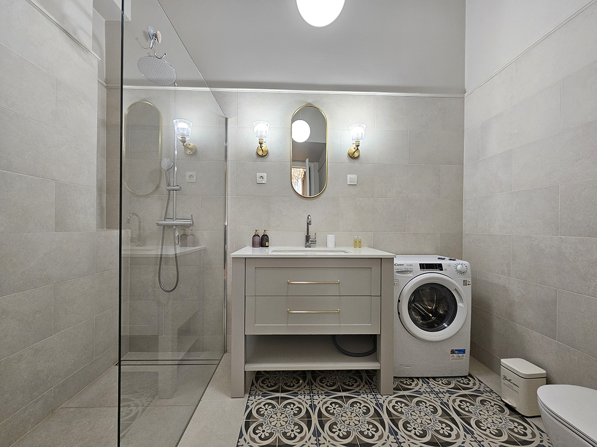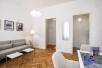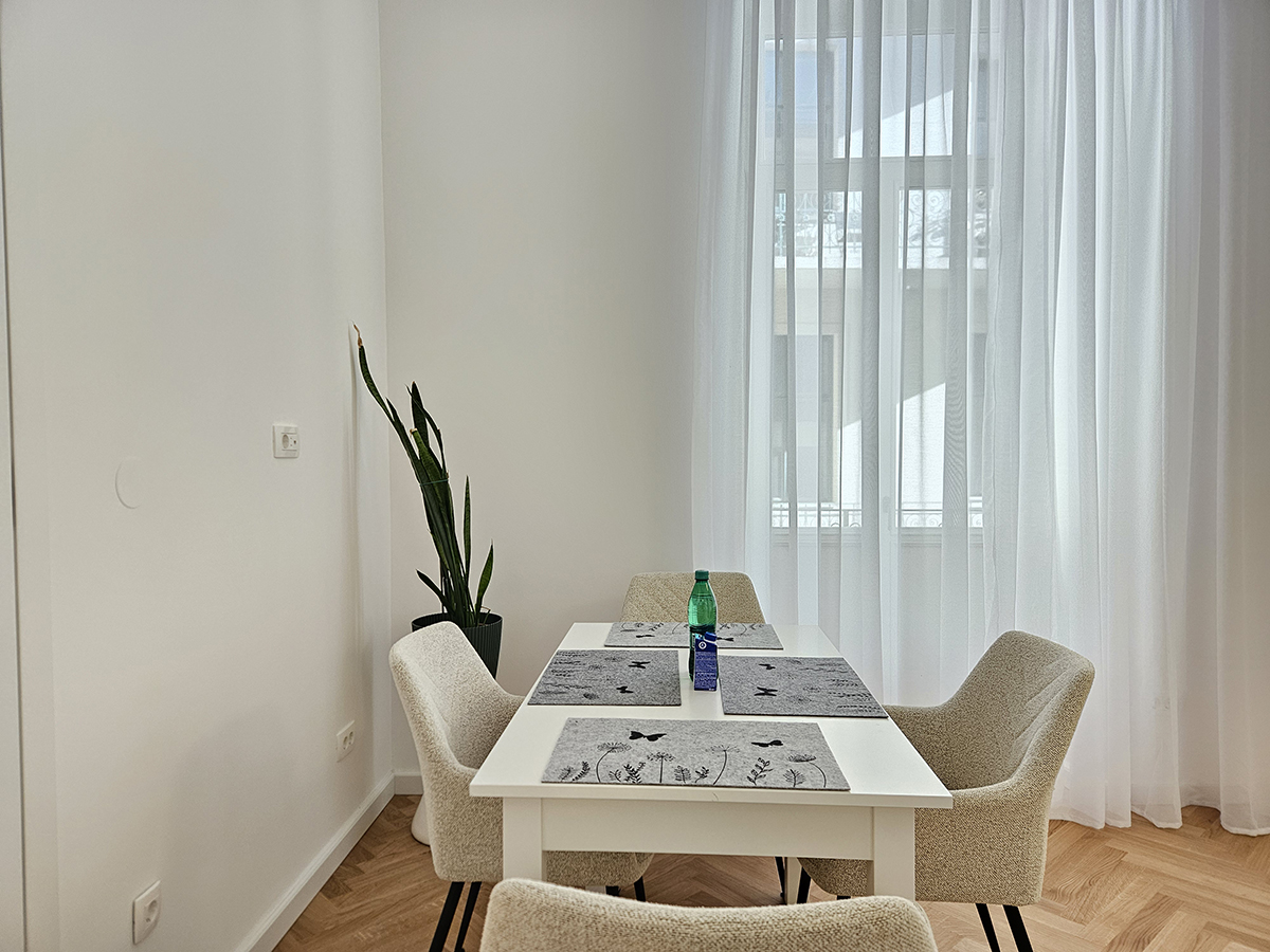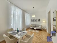 The fully renovated and bright Wolfova W2 apartment with high ceilings is located on Wolfova Street in the pedestrian area, on the first floor of an old bourgeois building with no lift. The apartment has a spacious living area with a dining table, a seating area that extends into an extra bed (110 x 190 cm) and a kitchenette with two hobs, a kettle, a toaster, crockery and cutlery and refrigerator. The room continues into the bedroom, where there is a double divisible bed (180 x 200 cm), a wardrobe and an LCD TV. From the bedroom there is an entrance to a spacious bathroom with shower, washbasin with cabinet, toilet and washing machine. The apartment overlooks the inner courtyard, away from the hustle and bustle of the city, with access to the screened balcony.