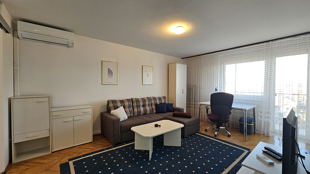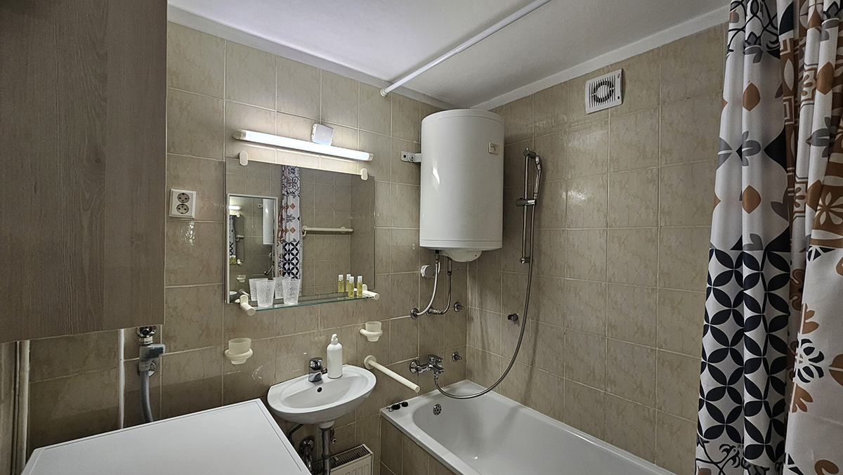 L’appartamento ha una camera da letto con due letti singoli (90×200cm), spaziosa sala di soggiorno con l’angolo d’affari ed il divano letto (140×200 cm) per altre 2 persone, cucina elettrica con il forno ed un grande frigorifero, il forno a microonde, angolo pranzo, il bagno con la vasca da bagno e la lavatrice, la toilette separata, ed il balcone con una vista sulla citta e sulla montagna. L’appartamento e completamente attrezzato con tutti gli apparecchi domestici, le posate, toaster, ferro e asse da stiro, asciuga capelli, CATV, telefono, l’accesso internet gratuito (Wi-Fi). I lenzuoli e gli asciugamani sono forniti. L’appartamento si trova al sesto piano di un edificio ed ha l’accesso con l’ascensore. Di fronte dell’edificio si trova un parcheggio pubblico.