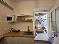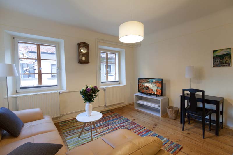 One bedroom apartment is on the 1st floor in a low building from 19th century with no elevator access. It was recently completely renovated. Rustical kitchen with dining corner for 4 persons is fully equipped with refrigerator, glass-ceramic cook-top, dish washer, microwave oven, dishes and cutlery. From the kitchen we proceed in a room with two single beds (90 x 200 cm) which can be divided or set together. In the living area there is a working corner, LCD TV and comfortable sofa, which can serve also as additional bed for 1 person (180 x 130 cm). From the kitchen area there is a small hallway with spacious closet and access to the bathroom with shower, toilet and sink.