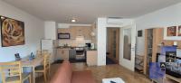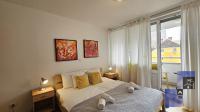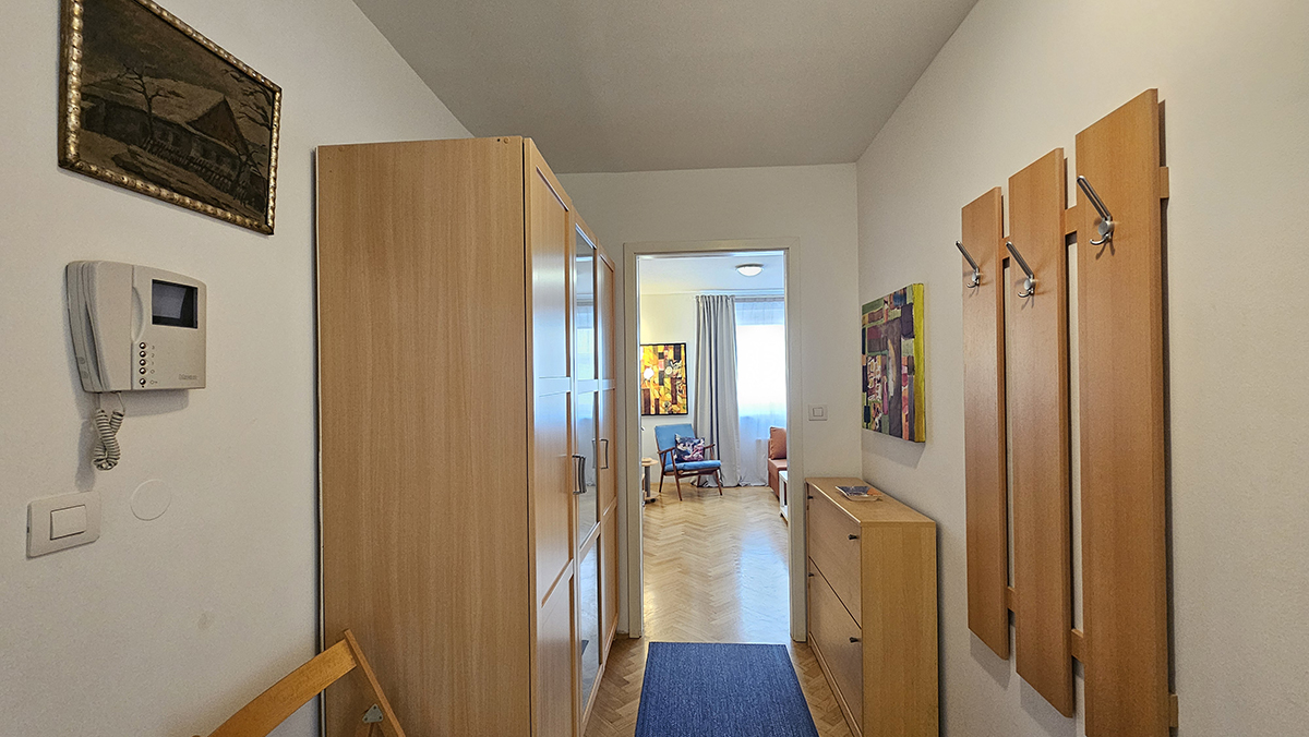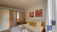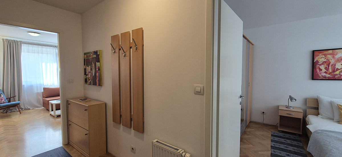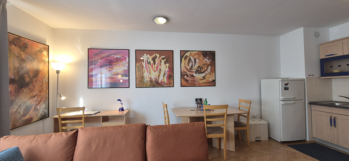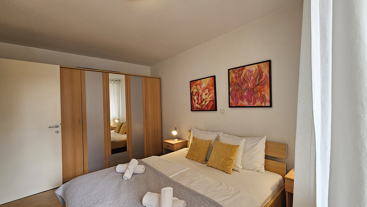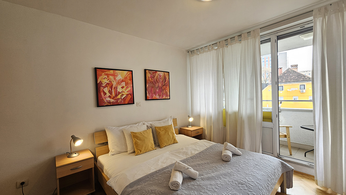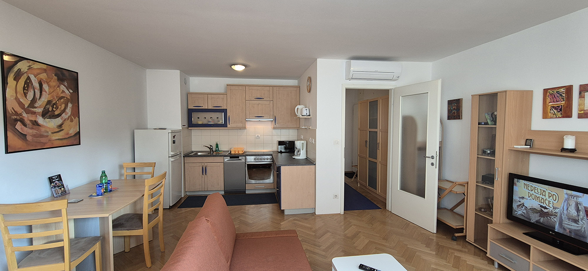 The apartment has a bedroom with double bed (180 x 200 cm), kitchen with stove, oven, dish washer, big refrigerator, microwave oven, dining table and living area with sofa which falls down to a bed (140 x 200 cm), bathroom with shower and washing machine. The apartment also has a balcony where the guests can relax in warm days. It is fully equipped with cooking utensils, cutlery, towels, linen, iron, ironing board, hair dryer, telephone, LCD TV, CATV, free broadband wired and wireless (Wi-Fi) internet access, air conditioning.