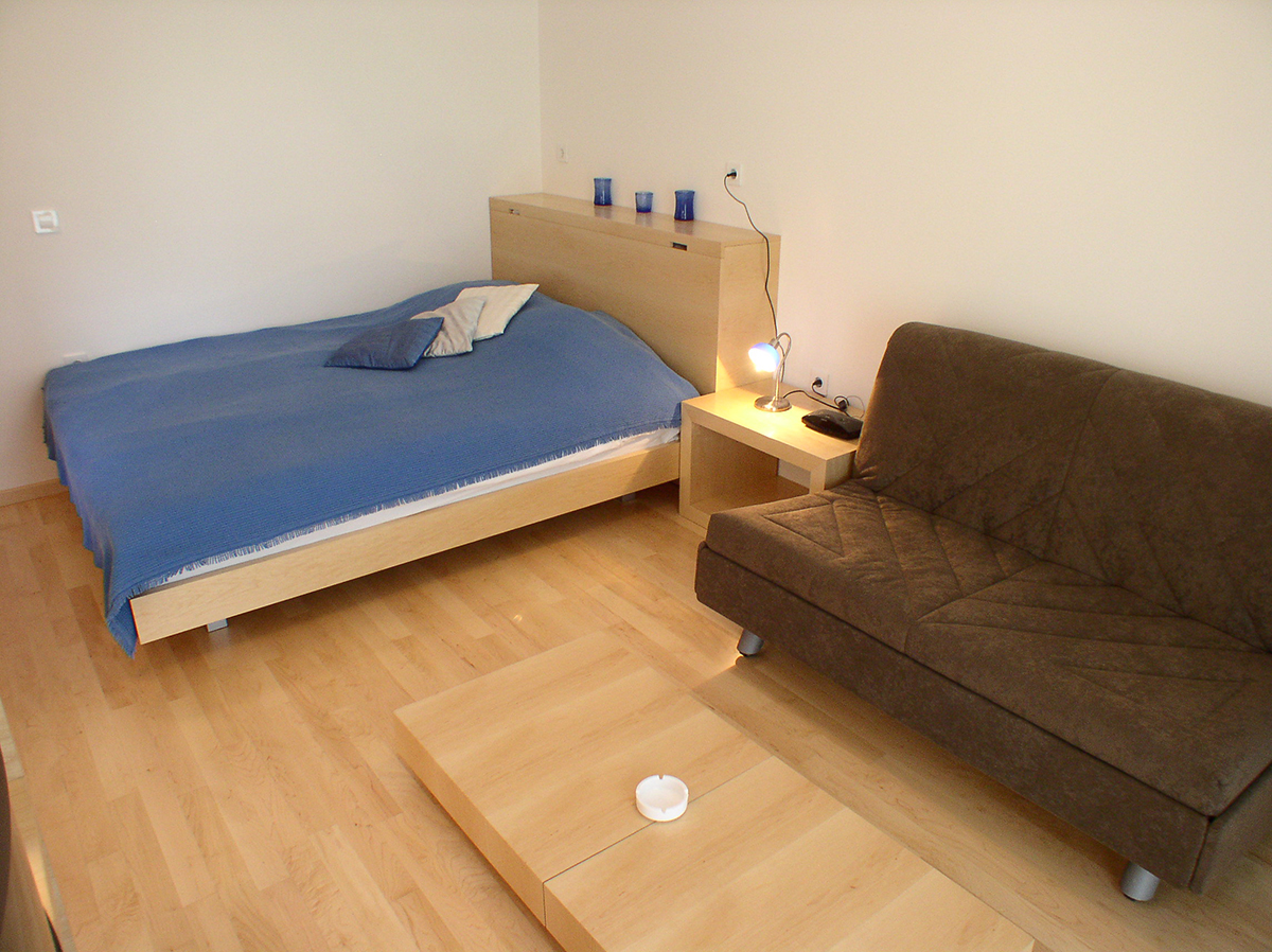 This modern studio has a room with bed (160 x 200 cm); there is a sofa next to it, which falls down to a bed (140 x 200 cm) and is air-conditioned. Sleeping area is connected to kitchen with dining table. Kitchen is equipped with kitchen utensils, cutlery, kitchen stove with oven, dishwasher and spacious refrigerator. The room has an exit to a covered balcony. Bathroom is equipped with shower, toilette and washbasin. There is also a washing machine in the apartment, LCD TV, CATV, telephone, free broadband wired and wireless (Wi-Fi) internet access, iron along with ironing board, hairdryer, bed linen and towels are provided.