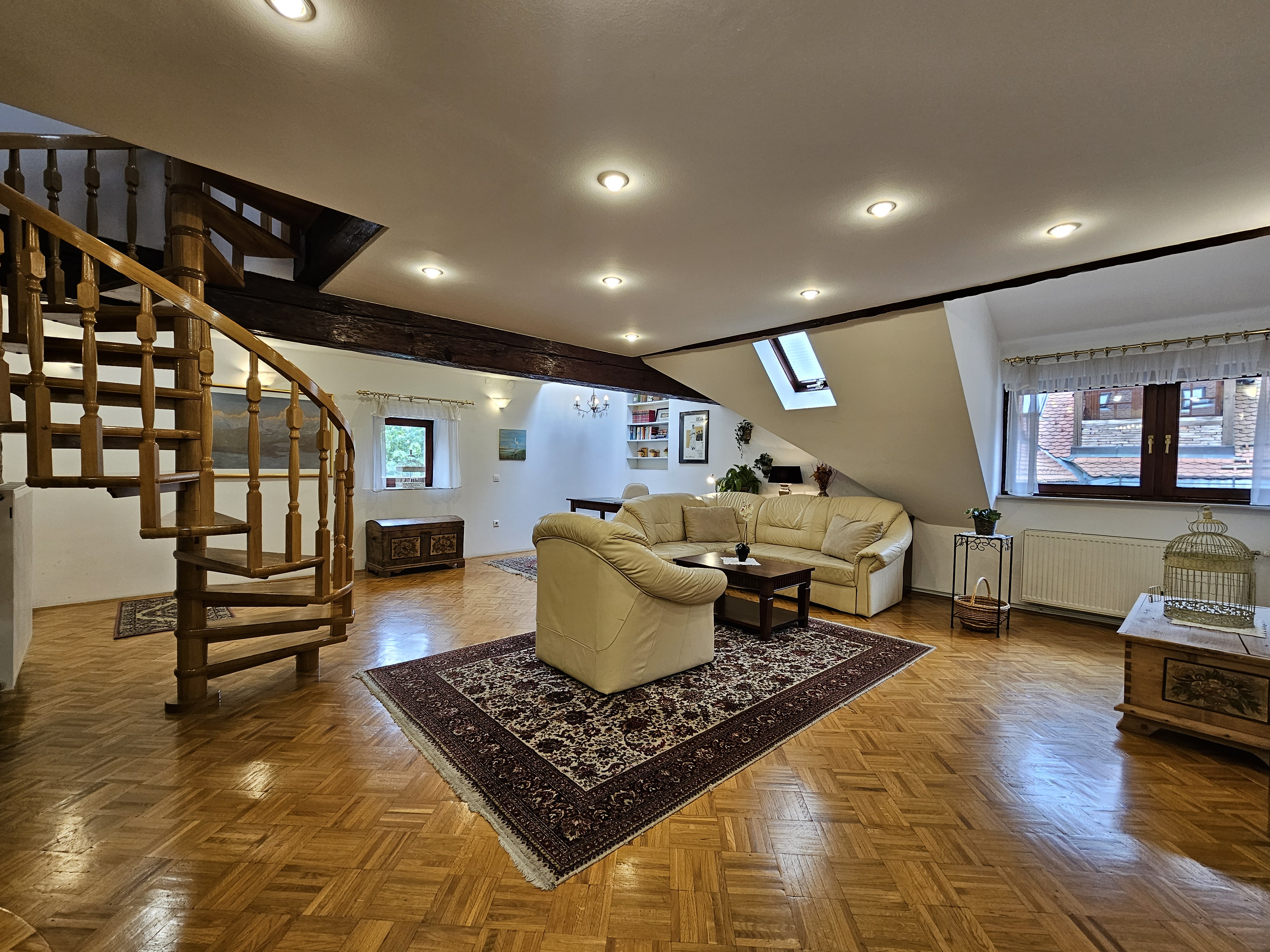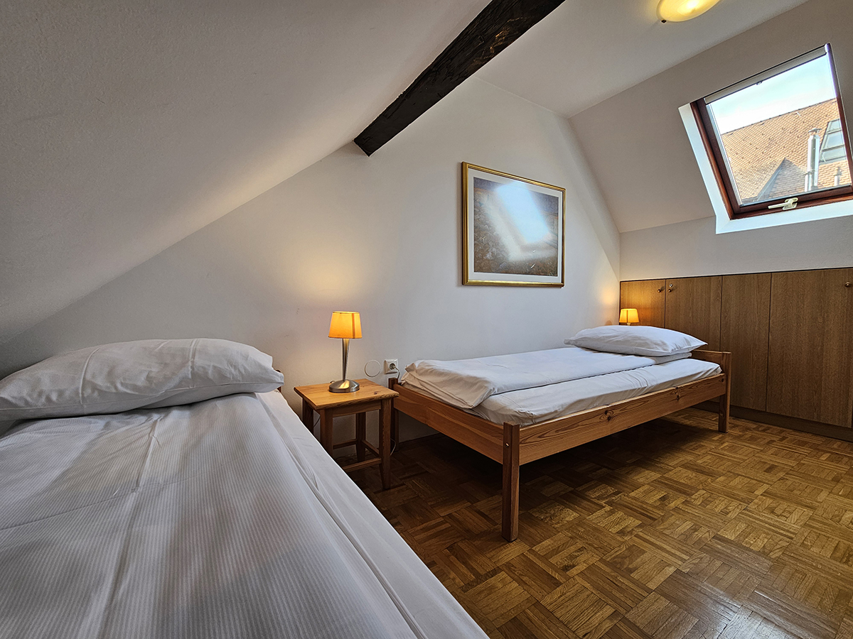 Ampio trilocale si trova nel centro storico in Mestni trg nella citta vecchia, un passo distante dal fiume Ljubljanica, famosi tre ponti e dal mercato aperto. Spazioso duplex, situato al 3. piano senza ascensore. Primo piano con cucina arredata con tavola per 6 persone, frigorifero, lavastoviglie, piano cottura e forno, soggiorno con arredamento in pelle ed accesso sul terrazzo, bagno con cabina doccia. Lavatrice nell'anticamera. Al secondo piano si trovano 2 camere, una con letto da una piazza e mezzo (140 x 200 cm), la seconda camera da letto con due letti singoli (90 x 200 cm). A disposizione LCD CATV via cavo, l’accesso internet gratuito, telefono e climatizzatore. Il lotto riservato di parcheggio è circa 450 m dall'appartamento (soltanto per i veicoli personali che non eccedono la lunghezza di 5 m) - il prezzo giornaliero e 15 €. Le prenotazioni devono essere fatte in anticipo.