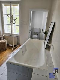Ванная комната в конце коридора оборудована ванной для купания, небольшим душем (размеры 70 см x70 см), раковиной, туалетом и стиральной машиной.